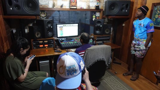 レコーディングスタジオで音源を確認