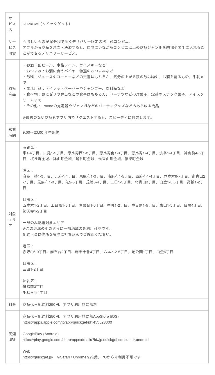 「QuickGet」は、2019年11月にサービス開始、2020年9月に正式リリースをしている日本初の「ダークストア(配達専用店)」を持った「Qコマース(即時配達)」デリバリーサービスです。「QuickGet」は、その名の通り約10分で ”今欲しいものを、今すぐ”あなたのもとにお届けします。対応商品は、食事やお菓子はもちろん、日用品や缶ビール、本格ワインまで、豊富な品揃えの商品を取り揃えており、2021年12月からは、これまでの製品に付け加えて生鮮食品の販売も始めました。また、自社で在庫を抱えることで実店舗と同等な価格を実現。 送料は、配送距離に関わらず一律250円です。