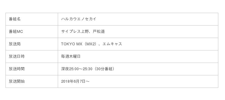 多彩なカルチャーの守備範囲の広さを持つ“サイプレス上野”と人気声優の“戸松遥”がダブルMCを務める音楽情報番組「ハルカウエノセカイ」がTOKYO MX2にて6/7(25:00-25:30)より毎週木曜日に放送開始。