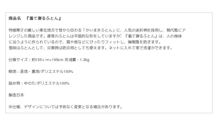 今回の商品は、寒さの厳しい東北地方で昔から伝わる「かいまきふとん」に、人気の迷彩柄を採用、現代風にアレンジしたふとんです。半てんのように羽織れて、眠くなったらそのまま寝れるので、ふとんとしても使えます。