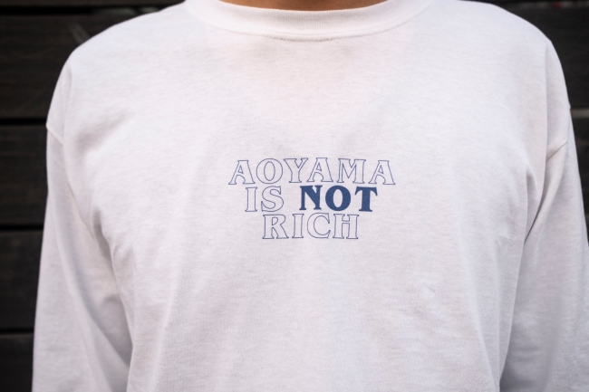 "AOYAMA IS NOT RICH"のメッセージとバックプリントには全国児童相談所共通ダイアルの"call at 189(イチハヤク)"がデザインにあしらわれています。
