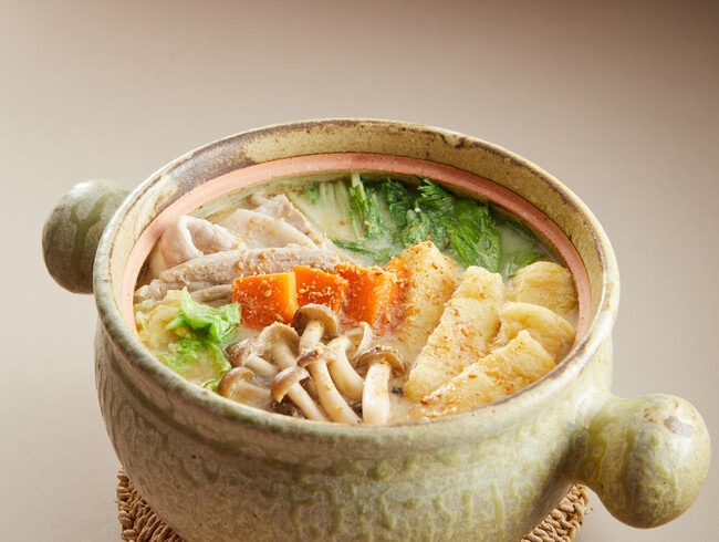 基本の一番だしに、無調整豆乳、すりごま、ねりごまを加えて作る特製「ごま豆乳出汁」鍋。お好みでラー油を入れると、より濃厚な味わいをお楽しみいただけます。