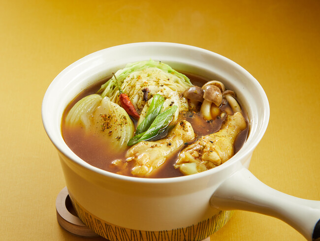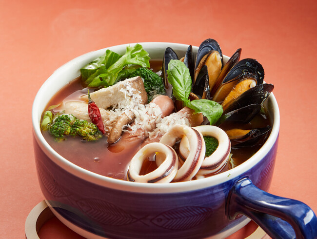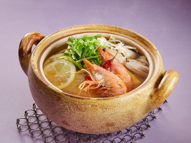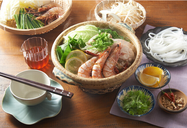 ナンプラーやお酢で味付けした基本の一番だしに、唐辛子と生姜を加え、レモングラスの爽やかな香りが食欲をそそる「エスニック出汁」鍋。お好みでパクチ―やレモンを添えると、より本格的にお楽しみいただけます。