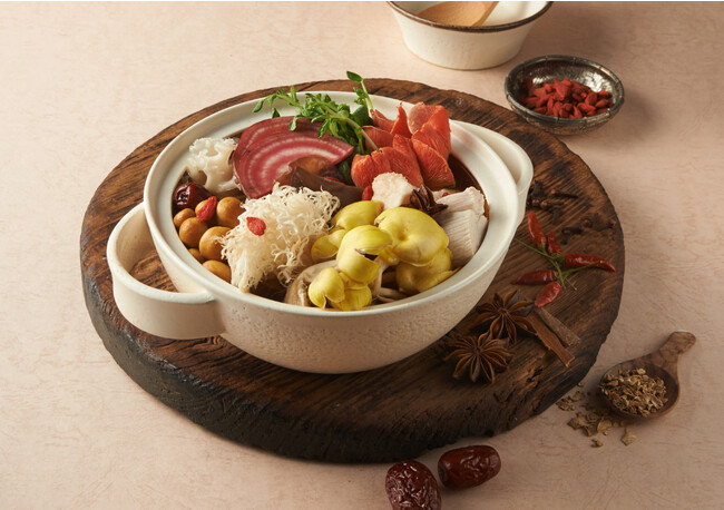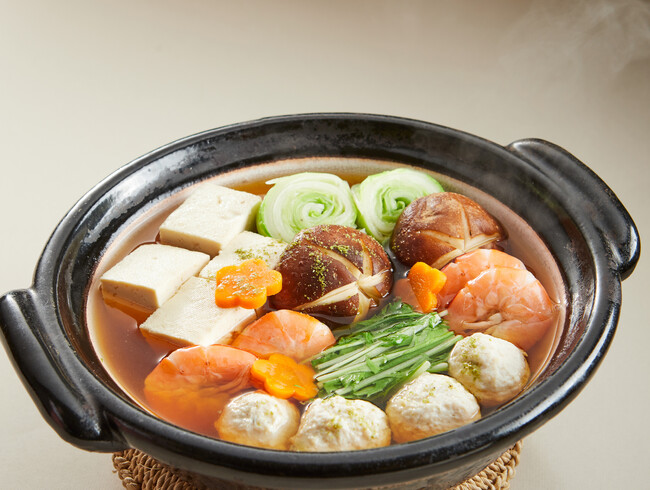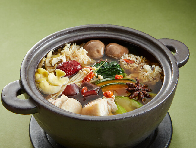 特製つゆで味付けした基本の一番だしに、なつめ、八角、クコの実などの和漢素材を加えて作る本格的「薬膳出汁」鍋。一番だしがベースのクセがないすっきりとした味わいをお楽しみいただけます。