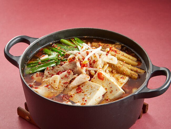 基本の一番だしに、にんにく醤油とみりん、生姜の特製つゆで味を付け、香り高い日本の唐辛子と、甘み・うまみが特徴の韓国唐辛子を加えて作る「辛にんにく出汁」鍋。付属のごま油やすりごまを入れると、よりコクと深みが増します。