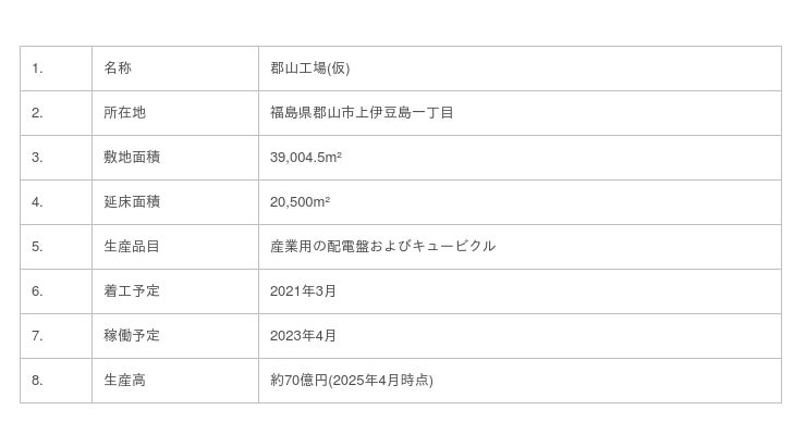 以上のことから、関東圏近郊に工場を新設することでこれらの問題が解消できると考え、キュービクルや配電盤の生産工場を福島県郡山市に建設することを決定しました。
