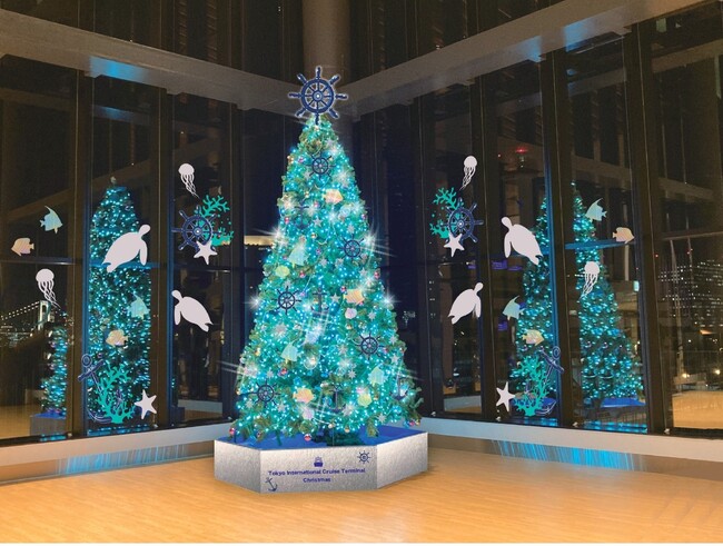 はるか彼方まで広がる瑠璃色の海を連想させるクリスマスツリーの彩りで、海の中の生き物たちと