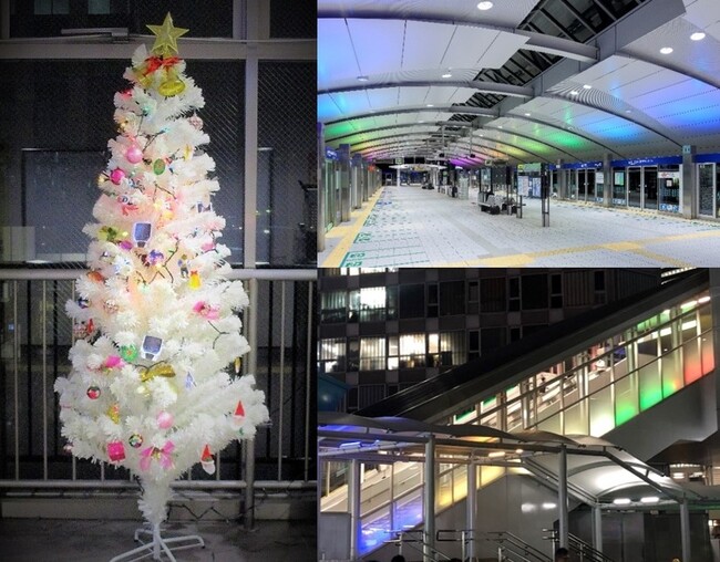 「お台場海浜公園駅」改札内ではホワイトツリーがクリスマスシーンを演出します。