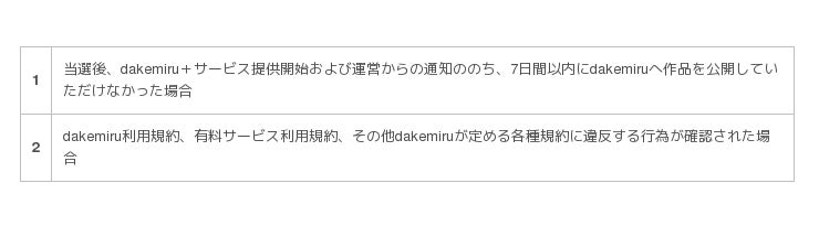 当キャンペーンは「dakemiru+」の機能モニター募集を目的としているため、以下の条件に該当する場合、またはdakemiruの定める各種規約に反する行為が確認された場合、当選後に「dakemiru+」サービスの利用権限を解除させていただきます。