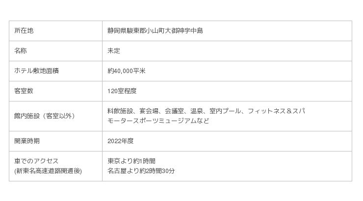 [1] 東和不動産は、ホテル建設予定地を富士スピードウェイ株式会社(本社:静岡県駿東郡小山町、取締役社長:原口英二郎)より賃借します。