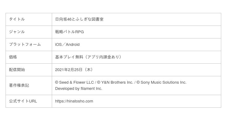 株式会社ソニー・ミュージックソリューションズ(本社:東京都港区、 代表取締役:古川愛一郎、渋谷学)は、日向坂46新作スマートフォンゲームアプリ 『日向坂46とふしぎな図書室』 を、2021年2月25日(木)にApp Store/Google Playにてリリースすることを決定いたしました。本日2月12日(金)よりApp Store/Google Play両ストアで事前登録受付を開始いたします。また、公式サイト、YouTubeにてPV第3弾を公開いたしました。