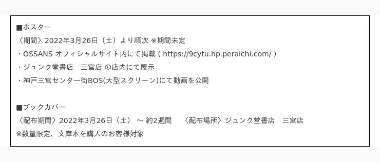 神戸・三宮商店街の事業者有志チームと合同会社quodとジュンク堂書店は、2022年3月26日(土)より「神戸三宮・元町の商店街のおじさん達をカッコよくしてみたポスター展~ OSSANS(オッサンズ) ~」を実施します (URL:https://9cytu.hp.peraichi.com/ )。また、今回はそのOSSANSのオリジナルブックカバーを制作し、神戸が発祥の地であるジュンク堂書店 三宮店にて数量限定で配布、商店街からも積極的に神戸の「おしゃれ」を盛り上げていきます。
