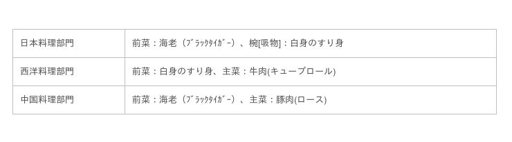 ●あらかじめ告知の上提供される主材料を用いて指定の課題作品を調理する。