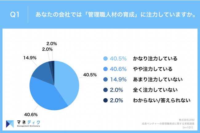 「Q1.あなたの会社では『管理職人材の育成』に注力していますか。」(n=101)と質問したところ、「かなり注力している」が40.5%、「やや注力している」が40.6%という回答となりました。