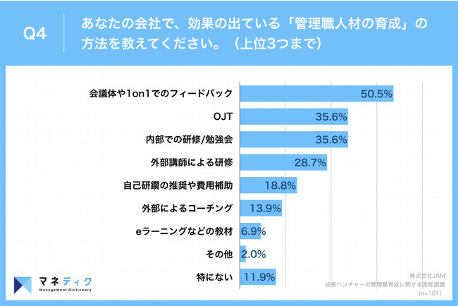 「Q4.あなたの会社で、効果の出ている『管理職人材の育成』の方法を教えてください。(上位3つまで)」(n=101)と質問したところ、「会議体や1on1でのフィードバック」が50.5%、「OJT」が35.6%、「内部での研修/勉強会」が35.6%という回答となりました。