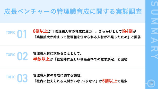 今回は、3期連続で増収を達成しているベンチャー企業の経営者/役員101名に対し、成長ベンチャーの「管理職人材の育成」に関する実態調査を行いました。