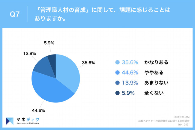 「Q7.『管理職人材の育成』に関して、課題に感じることはありますか。」(n=101)と質問したところ、「かなりある」が35.6%、「ややある」が44.6%という回答となりました。