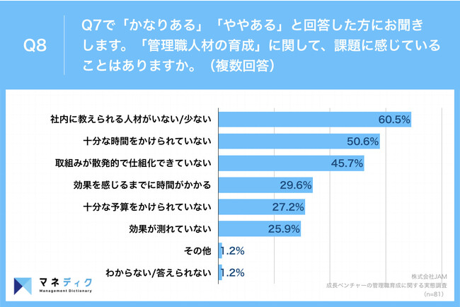 Q7で「かなりある」「ややある」と回答した方に、「Q8.『管理職人材の育成』に関して、課題に感じていることはありますか。(複数回答)」(n=81)と質問したところ、「社内に教えられる人材がいない/少ない」が60.5%、「十分な時間をかけられていない」が50.6%という回答となりました。