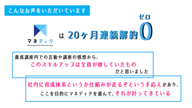 マネディクは「内部で育てられるようになる、が大きな価値」をコンセプトにした、これまでになかった管理職育成サービスです。