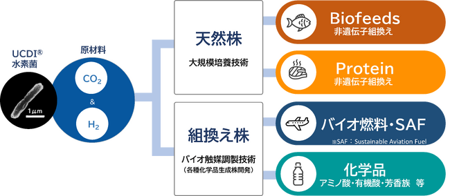 1.Biofeeds(飼料用動物性たんぱく素材)2.ヒト用プロテイン3.バイオ燃料 SAF4.各種化学品