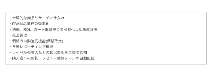 Amazon販売事業者に対して、商品リサーチからFBA納品、在庫管理、売上管理、アフターフォロー、分析までを包括的に支援するクラウドサービスです。