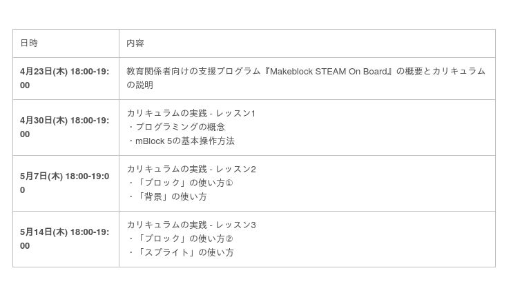 STEAM教育ソリューションを提供するMakeblock Co., Ltd(以下Makeblock、本社:中国深セン市、創業者CEO:王建軍)の日本法人 Makeblock Japan 株式会社は、この度、教育関係者向けの新たな支援プログラム『Makeblock STEAM On Board』を立ち上げました。プログラムの第1弾として、教育関係者向けにプログラミング教育に関するオンライン勉強会を4月23(木)18:00より開催いたします。