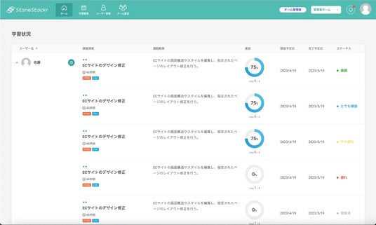 Webアプリケーション管理画面StoneStackrは、管理者が学習者のスキルを把握しやすいのも大きな特徴です。現在学習者が取り組んでいる課題はもちろん、学習計画や進捗状況、理解度も確認できます。