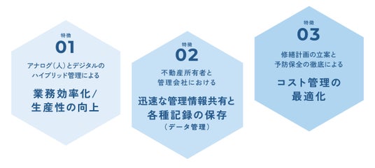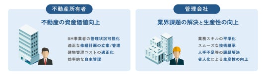 不動産所有者と管理会社間における迅速な情報共有、データに基づく施設管理コストの最適化、管理会社の業務スキル平準化等を可能にすることで、あらゆる不動産の資産価値向上を支援します。