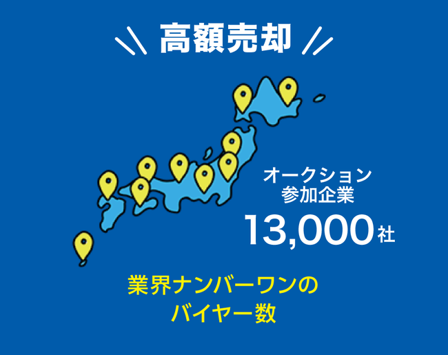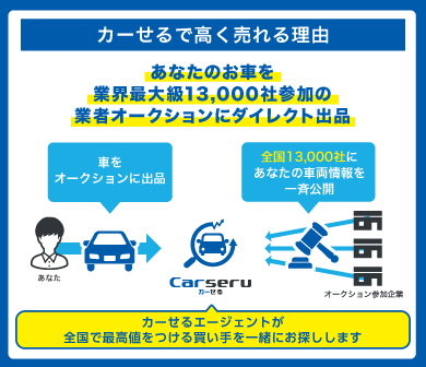『カーせる』は全国13,000社の提携中古車販売店が参加する中古車オークションへダイレクトに出品ができ、全国13,000社の中から最高値の買い手を一緒にお探しします。