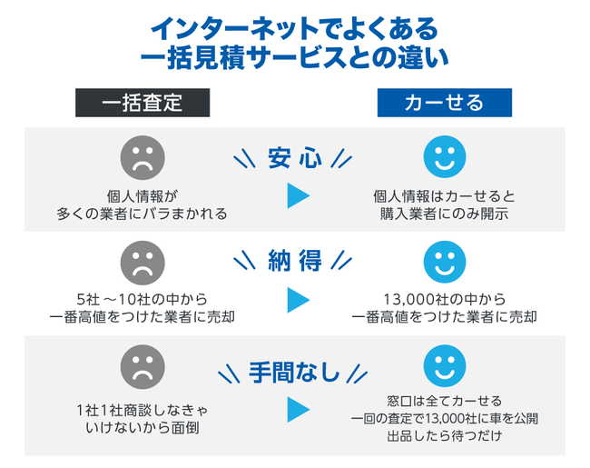 「自分で複数社と値段交渉のやり取りをするのが面倒」「下取り価格が低い」など、よくこんなお悩みのご相談を賜ります。『カーせる』なら、そんなお悩みをすべて解決致します。売却まで『カーせる』とやり取りするだけなので、安心で面倒な手間もありません。
