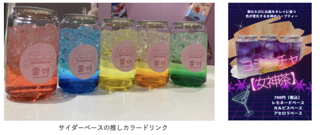 韓国で話題のボトルで提供するカフェ。カラフルな推しカラードリンクや、混ぜると色が変化するヨシンチャ、ボトルに入ったケーキなどインスタ映えを提供します。また、カラードリンクを活用して様々なコラボイベントも実施予定です。