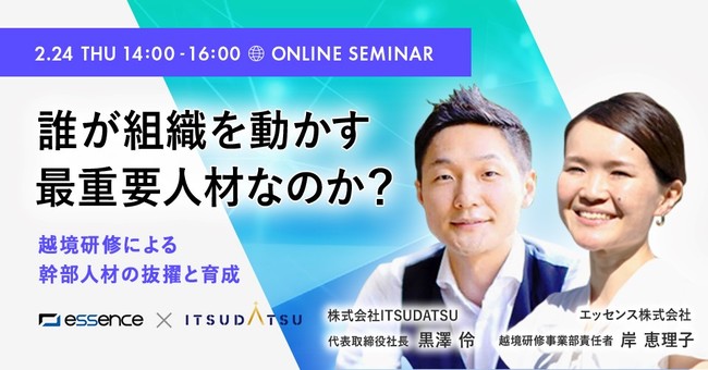 人材育成の優先順位を可視化する人材発掘サービス「KANAME(https://itsudatsu.com/kaname/)」を運営する株式会社ITSUDATSU(本社:東京都渋谷区、代表取締役CEO:黒澤伶)は、「新しい、仕事文化をつくる」をコーポレートミッションとし、働き方の選択肢を増やす5つの事業を展開するエッセンス株式会社(本社:東京都中央区、代表取締役:米田 瑛紀)と共同で、組織の人材抜擢や育成に課題を感じている経営者や人事担当者、新規事業責任者を対象に、「誰が組織を動かす、最重要人材なのか?~越境研修による幹部人材の抜擢と育成~」をテーマとした無料オンラインセミナーを、2月24日(木)に開催することをお知らせいたします。