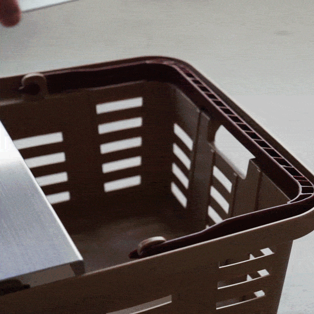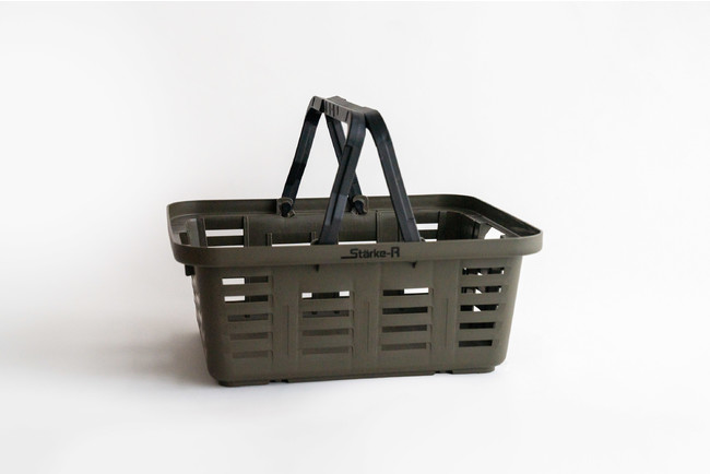 特殊構造によってハンドルを内側に倒せるので、同じ浅型バスケットや発売済みのレギュラーバスケットとスタッキング可能。中身が入ったままでも積み重ねることができます。