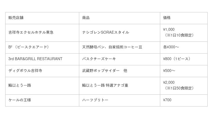 物品販売は東急百貨店 吉祥寺店 1階南口前にて実施。B²吉祥寺店は、ホテル内ベーカリーで作った焼き立て天然酵母パンと、清澄白河本店で焙煎されたフレッシュなスペシャリティーコーヒー豆をご用意します。