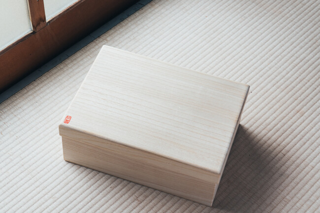 汎用モデルの「KUGUNOCHI-クグノチ-」は、よりシンプルなかぶせ蓋の桐箱で、こちらは天板の「桐尊」の朱印が特徴です。