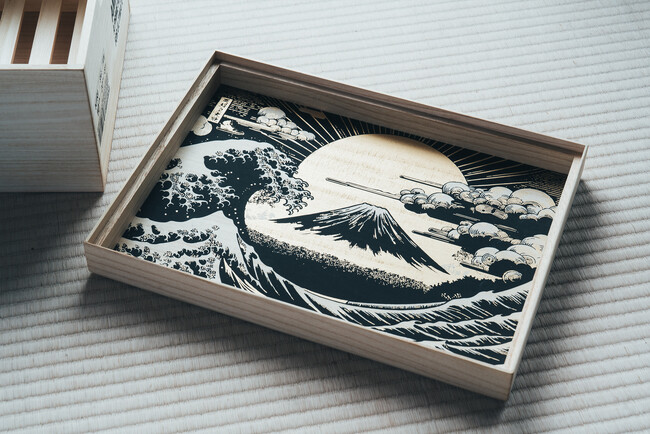 AMATERAS-アマテラス-は、スニーカーコレクターが最も価値を見出す一足を保管するために特別にデザインされたモデルです。蓋の天板には「天照至高無上ノ靴」と記され、朱印でブランド名「桐尊」が施されており、蓋裏には浮世絵をモチーフにした華やかなブラックとゴールドのイラストが描かれています。また、この桐箱は2層構造になっており、上段にスニーカーを、下段にはスニーカーの付属品を収納できる引き出しが付いています。加えて、箱側面にはオリジナル文言をレーザー刻印を入れることができ、世界にひとつだけの桐箱を創ることが可能です。