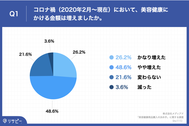 「Q1.コロナ禍(2020年2月~現在)において、美容健康にかける金額は増えましたか。」(n=111)と質問したところ、「かなり増えた」が26.2%、「やや増えた」が48.6%という回答となりました。