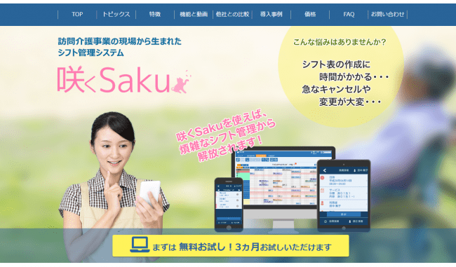「咲くSaku」は、訪問介護事業の現場から生まれたシフト管理サービスです。シフト表の作成から管理までの業務を効率的に表示、作業時間を大幅に削減することができます。また、外出先からスマートフォンアプリで確認登録が可能で、データを端末に保持しないので、紛失や盗難の際にも安心です。