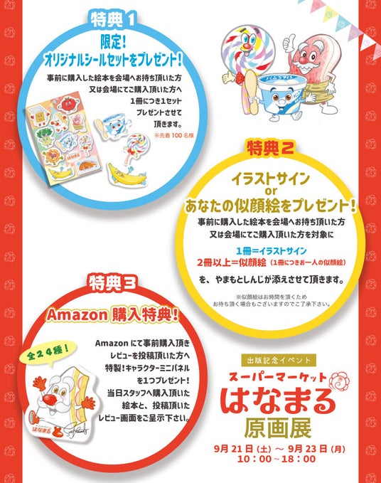 特典:絵本をご購入またはご持参いただいた方には、オリジナルグッズのプレゼントや、やまもとしんじ氏によるサイン・似顔絵の特典もご用意しております。