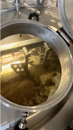 絞りかすの中にカカオ皮が混ざっている様子この後、酵母を投入し、あとは発酵・熟成を待つのみです。どんなビールになるかは、まだ想像しかありません。