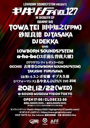 エレクトロバンドLOWBORN SOUNDSYSTEMプレゼンツにて約16年間で第127回を記録する(打ち込み系ユニット中心のLIVE、DJ、お笑い)によるイベント『ギリギリシティ』が12/22(水)渋谷VISIONにて多数の豪華ゲストを迎えスペシャル版を開催する。