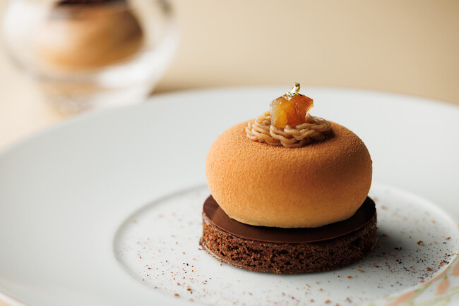 コロンと丸いフォルムが美しいマロンのムース。サブレ・ブルトン・ショコラをベースにカカオ75%のショコラディスク、マロンビスキュイとブルーベリーとグロゼイユのコンフィを忍ばせたマロンのムースをのせ、マロンペーストとマロンのトッピングをのせた秋に相応しい一品です。別添えのマダガスカル産ショコラ75%のアイスと一緒に堪能ください。