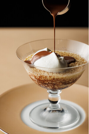 グラスの中に、ヘーゼルナッツとコーヒー豆を砕いたプラリネカフェ、マスカルポーネクリーム、コーヒーに浸したビスキュイ、マダガスカル産カカオを使った滑らかなショコラクリームが何層にも重なっています。上から温かいショコラカフェソースをかけてお楽しみください。