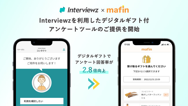 ヒアリングDXを実現するノーコードSaaSサービス「Interviewz(インタビューズ)」を手掛けるラーナーズ株式会社(本社:東京都渋谷区、代表取締役:石井学)は、デジタルギフトサービス「mafin(マフィン)」の提供を行う株式会社マフィン(本社:東京都渋谷区、代表取締役社長:尹 喜重)と業務提携契約を締結し、2023年8月15日よりInterviewzを利用したデジタルギフト付アンケートツールをご提供するサービスを開始いたします。