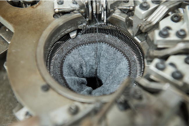 非効率から生まれる独自の仕様と製法が、心地良さのヒミツ。ゴムの代わりに裏糸に伸縮性のある糸を全体に編み込み、ストッキングのように全体で伸縮する仕様。履き口にだけゴムを入れた靴下と違い、一カ所に圧が集中しません。製法はたっぷりの糸を低速でゆっくり大きく編み、ゆるめのプレスで縮めて仕上げています。