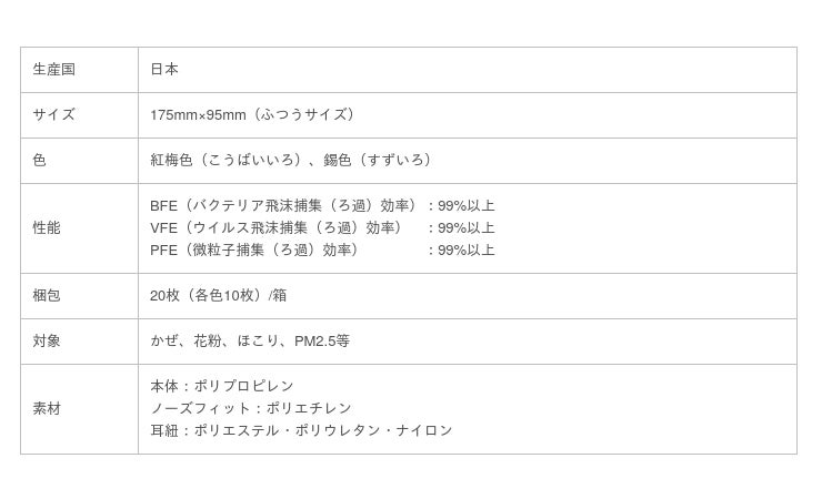 マスクフィルター性能は、BFE(バクテリア飛沫捕集(ろ過)効率)、VFE(ウイルス飛沫捕集(ろ過)効率)、PFE(微粒子捕集(ろ過)効率)が全て99%以上。※ネルソン研究所にて取得