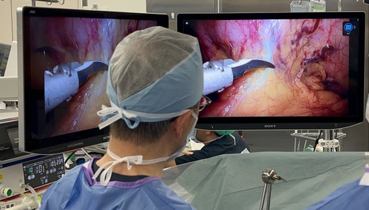 兵庫医科大学病院におけるEureka α の使用風景。右モニターに表示された水色の疎性結合組織を時折確認しながら、手術を実施している。