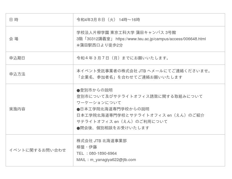 サテライトオフィス開設にあたり、登別市と日本工学院北海道専門学校が連携し、同校キャンパス内に整備されたサテライトオフィス及びテレワーク環境についてのご案内のほか、実際にご利用いただく際のご相談の機会として、当該イベントを企画致しました。