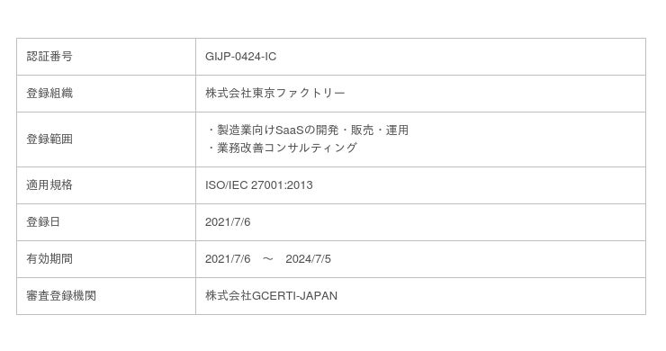 株式会社東京ファクトリー(本社:東京都文京区、代表:池 実、以下東京ファクトリー)は、情報セキュリティマネジメントシステム(ISMS:Information Security Management System)の第三者認証基準である国際規格「ISO/IEC 27001:2013」の認証を2021年7月6日付で取得いたしました。