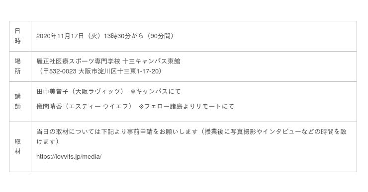 授業をおこなうのは、今月、45歳で前人未到のリーグ通算1600得点を達成した田中美音子選手と、大阪ラヴィッツを退団し、現在フェロー諸島でプレーしている儀間晴香選手です。